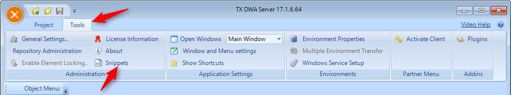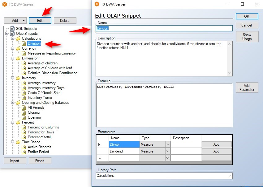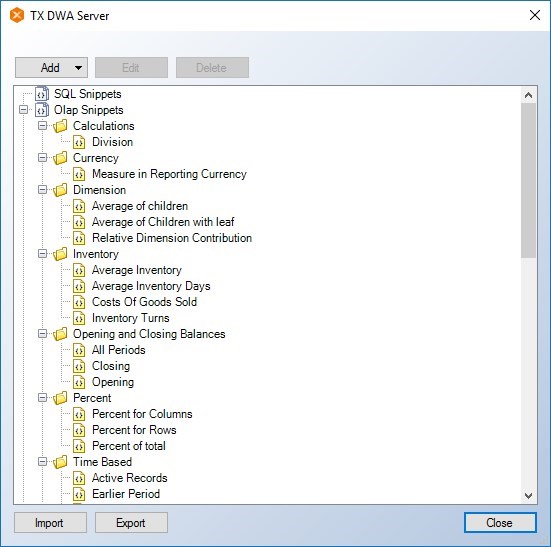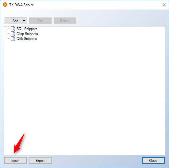 - A new box will come up which will be labelled TX DWA Server, but on the bottom, you will see SQL Snippets, Olap Snippets and Qlik Snippets.